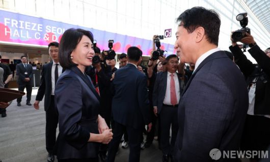 [서울=뉴스핌] 정일구 기자 = 이재명 대통령 부인 김혜경 여사와 오세훈 서울시장이 3일 서울 강남구 코엑스에서 열린 '프리즈 서울 2025' 페어 투어 행사에서 인사를 나누고 있다. 2025.09.03 mironj19@newspim.com