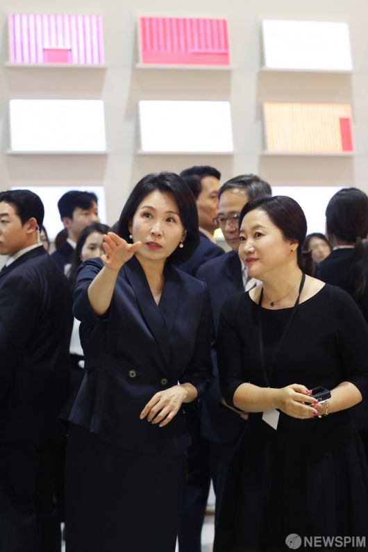 [서울=뉴스핌] 정일구 기자 = 이재명 대통령 부인 김혜경 여사가 3일 오전 서울 강남구 코엑스에서 열린 '프리즈 서울 2025' 페어 투어 행사에서 전시 작품들을 관람하고 있다. 2025.09.03 mironj19@newspim.com