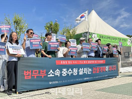 참여연대와 민주사회를 위한 변호사 모임은 3일 오전 서울 영등포구 국회 앞에서 기자회견을 열고 “정성호 법무부장관의 중수청을 법무부 소속으로 둬야 한다는 주장은 수사·기소 분리를 통한 검찰개혁 추진에 어깃장을 놓는 것”이라고 비판했다. 주최 측은 현재 법무부가 검찰 인사에 장악됐다는 점을 거듭 꼬집었다.