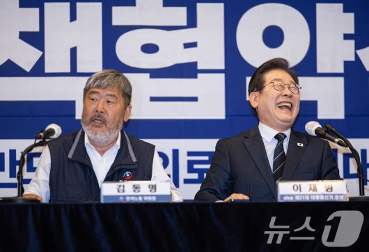 이재명 대통령이 지난 5월 1일 더불어민주당 대통령 후보 시절 한국노총 정책협약식에서 김동명 위원장과 대화 도중 미소를 지은 모습. 2025.5.1/뉴스1 ⓒ News1 이재명 기자 |