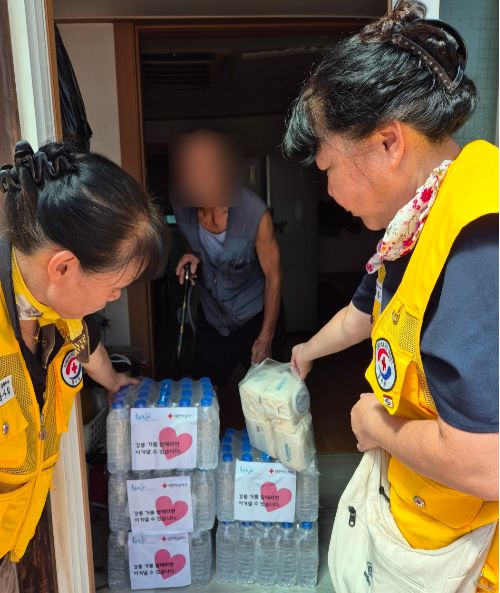 대한적십자사 강원특별자치도지사 봉사원들이 취약계층에게 생수를 전달하고 있다. [대한적십자사] |