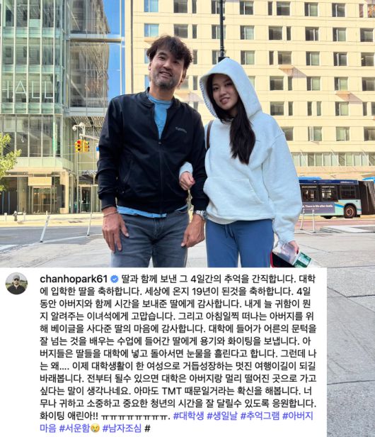 딸이 성인으로서의 첫발을 내딛는 것에 대한 설렘과 아쉬움이 교차하는 듯, 박찬호는 “아버지들은 딸들을 대학에 넣고 돌아서면 눈물을 흘린다고 한다. 그런데 나는 왜...”라고 운을 떼며 딸을 향한 진솔한 마음을 밝혔다. 이어 “이제 대학 생활이 한 여성으로 거듭 성장하는 멋진 여행길이 되길 바란다”고 응원했다.