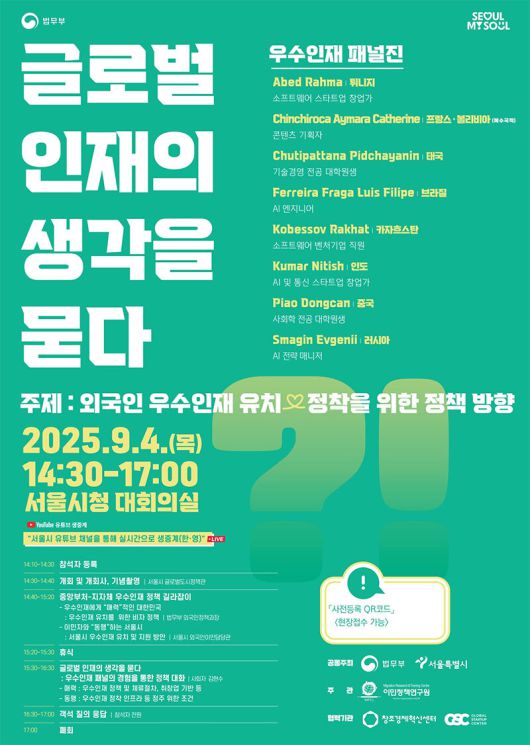 서울시와 법무부가 4일 오후 2시30분 서울시청 대회의실에서 ‘글로벌 인재의 생각을 묻다’를 주제로 해외 우수 인재 유치 및 정착을 위한 라운드테이블을 함께 개최한다.