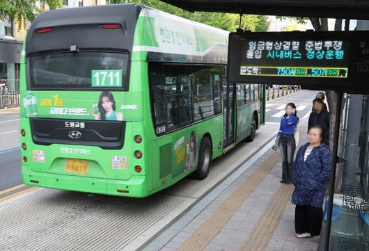 서울 시내버스 노사협상이 결렬되면서 노조가 ‘준법투쟁’에 돌입한 지난 4월 30일 오전 용산구 한 버스 정류장 전광판에 준법투쟁 안내문이 표시되고 있다. 기사 내용과는 무관함.(사진=연합뉴스) |