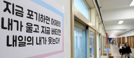(부산=뉴스1) 윤일지 기자 = 2026학년도 대학수학능력시험 9월 모의평가가 치러진 3일 부산 금정구 부산사대부고 3학년 교실 앞 복도에 '지금 포기하면 어제의 내가 울고 지금 버티면 내일의 내가 웃는다'는 문구가 붙어 있다. 2025.9.3/뉴스1 Copyright (C) 뉴스1. All rights reserved. 무단 전재 및 재배포, AI학습 이용 금지. /사진=(부산=뉴스1) 윤일지 기자 |