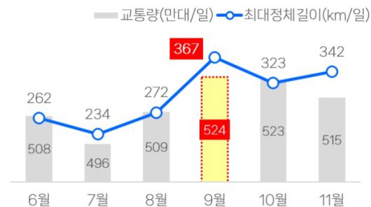최근 3년간(2022년~2024년) 교통량 및 최대 정체길이./한국도로공사 |