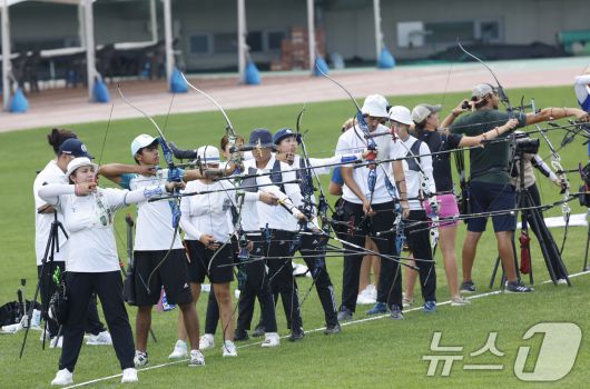 (광주=뉴스1) 김태성 기자 = 3일 광주시 월드컵경기장에서 '광주 2025 현대 세계 양궁선수권대회' 출전 선수들이 대회를 앞두고 연습경기를 하고 있다. 세계양궁선수권대회 및 세계장애인양궁선수권대회는 9월 5-28일 광주국제양궁장 및 5·18 민주광장에서 펼쳐진다. 2025.9.3/뉴스1