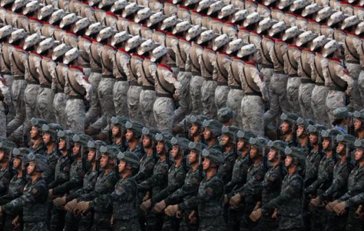 중국 인민해방군 병사들이 3일 베이징 톈안먼 광장에서 열린 열병식에 참여하기 위해 행진하고 있다. 베이징=EPA 연합뉴스 |