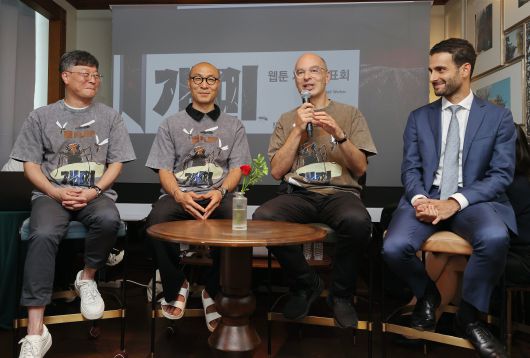 3일 서울 강남구 크레센도서울호텔에서 열린 웹툰 '개미' 제작발표회에서 원작 소설 작가 베르나르 베르베르가 인사말을 하고 있다. 왼쪽부터 제작사 케나즈의 이우재 대표, 김용회 웹툰 작가, 베르나르 베르베르 작가, 피에르 모르코스 프랑스 대사관 문화 참사관./연합뉴스 |