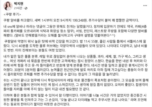 박 전 위원장은 “쿠팡 알바를 하고 왔다”며 “새벽 1시부터 오전 9시까지 19만9548원. 추가 수당이 붙어 꽤 짭짤한 금액”이라며 일당을 공개했다.