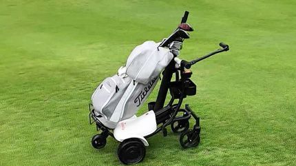 골퍼가 골프채를 꺼내 티샷을 하고 페어웨이로 걸어 나가자 기계가 곧바로 따라 움직입니다.