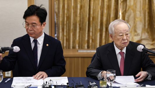 3일 한국경영자총협회가 프레스센터에서 개최한 '주요 기업 인사노무 담당 임원 간담회'에서 김영훈 고용노동부 장관(왼쪽)과 손경식 한국경영자총협회 회장이 나란히 앉아 있다. 뉴스1 |