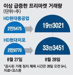 3일 코스콤에 따르면 지난달 27일 합병 공시가 발표된 HD현대중공업과 HD현대미포는 매매거래 정지 공시 후 다음 날 오전 프리마켓에서 거래됐다. 거래소에는 27일 오후 3시 45분부터 28일 오전 9시까지 매매거래가 정지된다고 공시됐지만 28일 오전 8시부터 9시까지 1시간 동안 NXT에서 각각 19만3021주(1038억원), 33만3451주(720억원) 거래됐다.