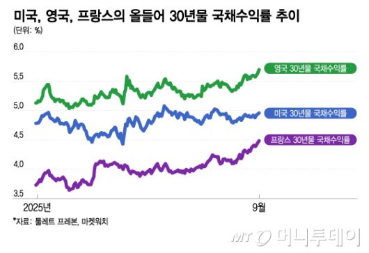 미국, 영국, 프랑스의 올들어 30년물 국채수익률 추이/그래픽=이지혜 |