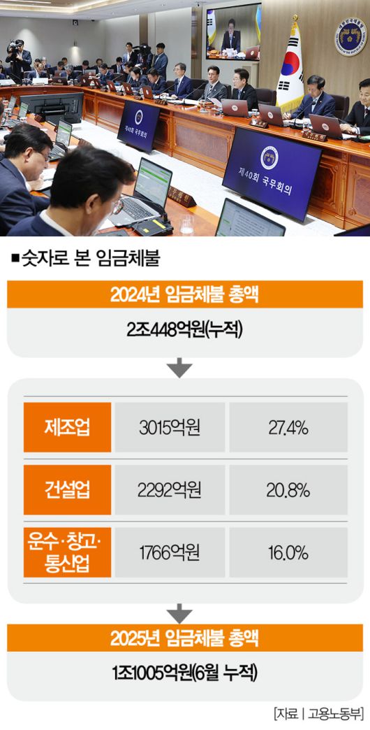 2조448억원. 2024년 기준 누적 임금체불 총액이다. 역대 최고치다. 업종별로는 제조업(3015억원ㆍ27.4%), 건설업(2292억원ㆍ20.8%), 운수ㆍ창고ㆍ통신업(1766억원ㆍ16.0%) 순으로 임금체불이 많았다. 올해 임금체불 총액은 지난 6월까지 1조1005억원(전년 동기 대비 5.5% 증가)으로 역대 최고 기록을 갈아치울 것으로 보인다.