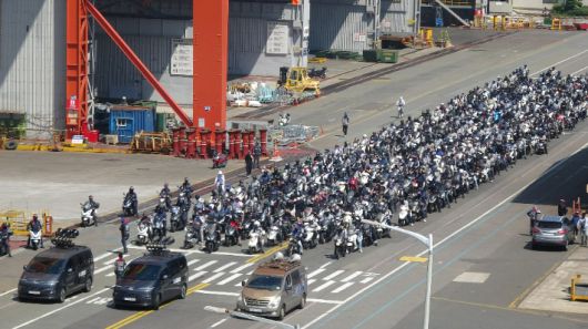 조합원 수백명은 오토바이를 타고 조선소 밖으로 나와 경적을 울리며 파업을 상황을 알렸다.