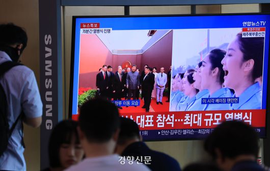 시민들이 3일 서울역 대합실에서 중국 전승절 80주년 기념식 생중계를 시청하고 있다. 이준헌 기자 |