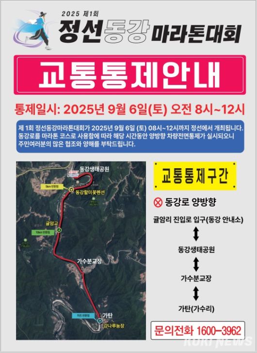 원활한 대회 진행을 위해 대회 당일인 6일 오전 8시부터 정오까지 전 구간(동강생태체험학습장~ 가탄 강나루농장) 교통통제가 시행된다.