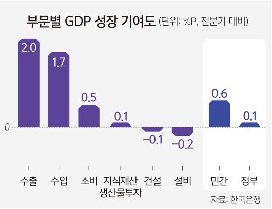 김화용 한은 국민소득부장은 “민간 수출과 소비가 성장을 주도했다”면서 “정부소비 기여도가 확대되고 민간소비가 플러스 전환하면서 소비를 중심으로 내수가 큰 폭의 플러스로 전환했다”고 설명했다.