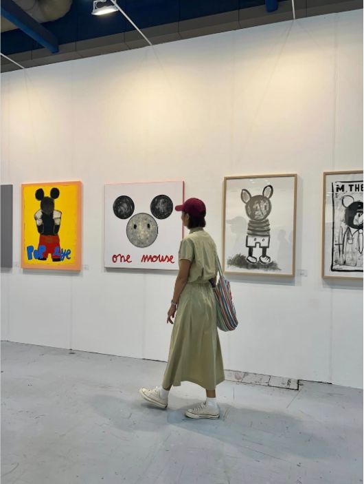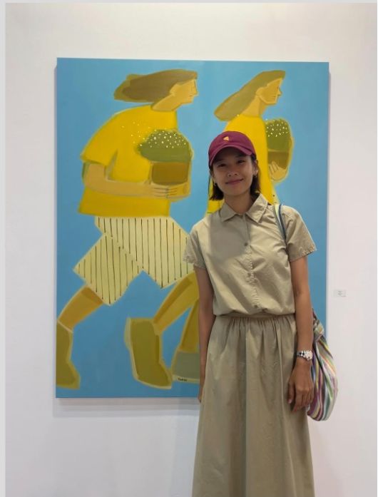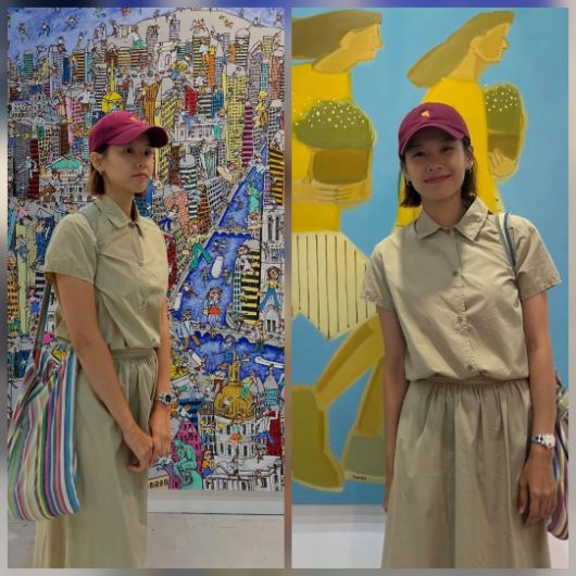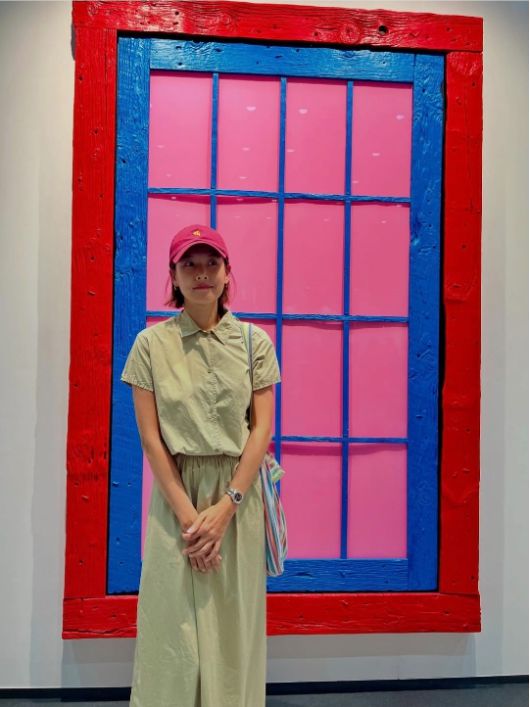 특히 어깨에 멘 스트라이프 패턴 가방과 배경 작품의 색감이 어우러지며 자연스러운 깔맞춤을 연출했다.
