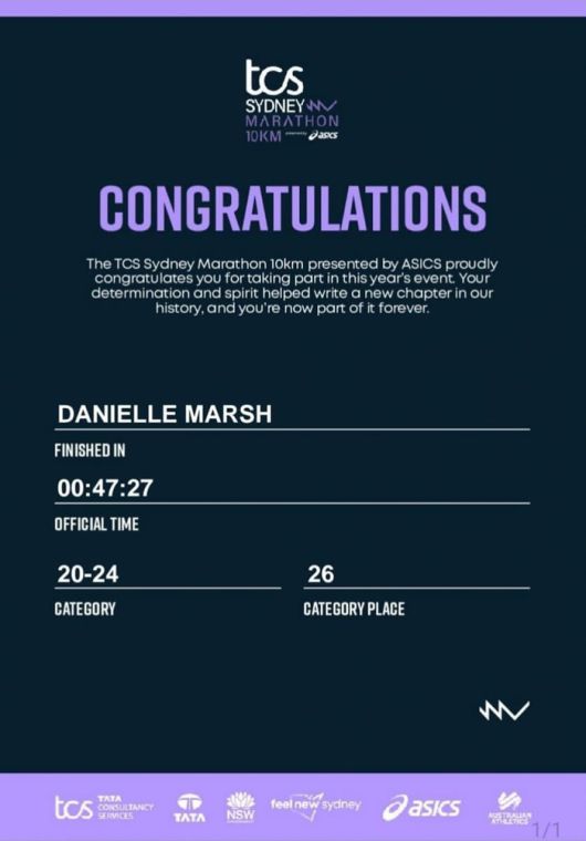 시드니 마라톤 공식 인증서에 따르면, 다니엘은 ‘TCS Sydney Marathon 10km’ 여성 20-24세 부문에 참가해 47분 27초의 공식 기록을 남기며, 해당 연령대 전체 참가자 중 26위에 올랐다. 러닝을 시작한지 불과 두 달 만에 거둔 기록으로, 첫 대회에서 완주는 물론 놀라운 성적을 기록했다.