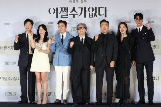 지난달 19일 서울 용산구 CGV 용산아이파크몰에서 열린 영화 ‘어쩔수가없다’ 제작보고회에서 감독과 배우들이 포즈를 취하고 있다. 왼쪽부터 박희순, 손예진, 이병헌, 박찬욱 감독, 이성민, 염혜란, 차승원. 연합뉴스 |