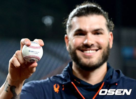 이번 시즌 228탈삼진 기록을 세운 한화 코디 폰세가 기념구를 들고 포즈를 취하고 있다. 2025.09.03 / dreamer@osen.co.kr