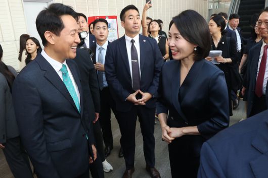 강성으로 평가받는 장동혁 지도부가 출범한 시점에 이뤄진 오 시장의 국회 방문은 정치권 이목을 끌었지만, 국민의힘 의원들이 특검 압수수색을 저지하기 위해 농성에 돌입하면서 당 지도부는 행사에 불참했다. 오 시장은 장 대표에 대해 “공세가 극심한 상황에 중심을 잡고 전열을 재정비하고, 외연을 확장해야 하는 양립하기 어려운 두 목표가 있다”며 “지도부 인선을 보니 안심이 된다. 고심 끝에 인선했다는 느낌을 받았다”고 했다. 이날 토론회에 참석한 이준석 개혁신당 대표를 향해선 “합당이든, 선거연대든 합심해 무도한 폭주 기관차를 견제할 필요가 있다”고 거듭 밝혔다. “9개월 뒤로 다가온 지방선거를 앞두고 가장 효율적인 견제는 개혁신당과의 협력”이라면서다.