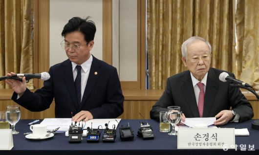 김영훈 고용노동부 장관(왼쪽)과 손경식 한국경영자총협회 회장이 3일 서울 중구 한국프레스센터에서 열린 주요 기업 노무담당자(CHO) 간담회에서 모두발언을 준비하고 있다. 송은석 기자 silverstone@donga.com |