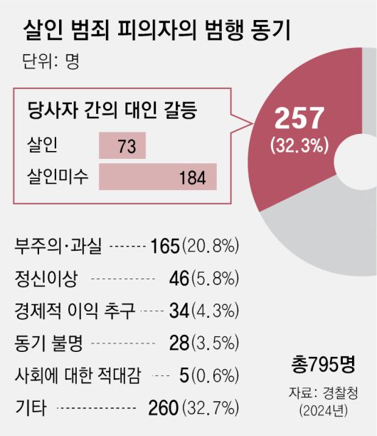 일상 속 갈등이 살인과 같은 극단적 범죄로 이어지는 경우가 잇따르며 우려의 목소리도 나온다. 경찰청에 따르면 지난해 발생한 살인 사건(미수 포함) 피의자 795명 중 ‘당사자 간의 대인 갈등’으로 인해 저지른 피의자가 257명(32.3%)으로 가장 많았다. 상대방과의 갈등으로 인한 분노가 개인적 감정에 그치지 않고 살인이라는 비극으로 이어지고 있는 것이다.