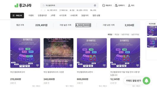 하지만 '중고 나라'를 보면 S석 2개를 24만 원이나 21만 원에 판매한다는 게시글이 올라와 있고, R석 4개 좌석의 경우 20만 원의 웃돈을 붙여 60만 원에 판매한다는 글도 있습니다.