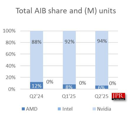 4일 시장조사업체 존페디리서치(JPR)에 따르면 올해 2·4분기 전 세계 데스크톱PC용 그래픽카드 시장에서 엔비디아의 점유율은 94%에 달했다. AMD와 인텔은 각각 6%, 0%의 점유율을 기록하는 데 그쳤다.