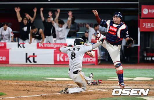 [OSEN=수원, 조은정 기자]3일 오후 수원KT위즈파크에서 ‘2025 신한 SOL BANK KBO리그’ KT 위즈와 롯데 자이언츠의 경기가 진행됐다.이날 경기에 KT는 헤이수스, 롯데는 감보아를 선발투수로 내세웠다. 9회말 1사 만루 롯데 3루수 박찬형이 KT 장진혁 땅볼 때 악송구를 범하며 끝내기 주자인 안치영의 득점을 허용하고 있다. 공을 잡지 못하는 롯데 포수 정보근. 2025.09.03 /cej@osen.co.kr |