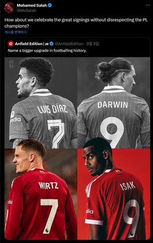 앞서 팔로워 50만명 이상인 '안필드 에디션'은 이번 시즌 리버풀이 영입한 플로리안 비르츠와 알렉산데르 이사크의 사진을 올리면서 지난 시즌을 마지막으로 팀을 떠난 루이스 디아스와 다르윈 누녜스의 사진을 함께 게재하며 "축구 역사에서 이보다 더 큰 업그레이드를 말해보라"라는 글을 남겼다.