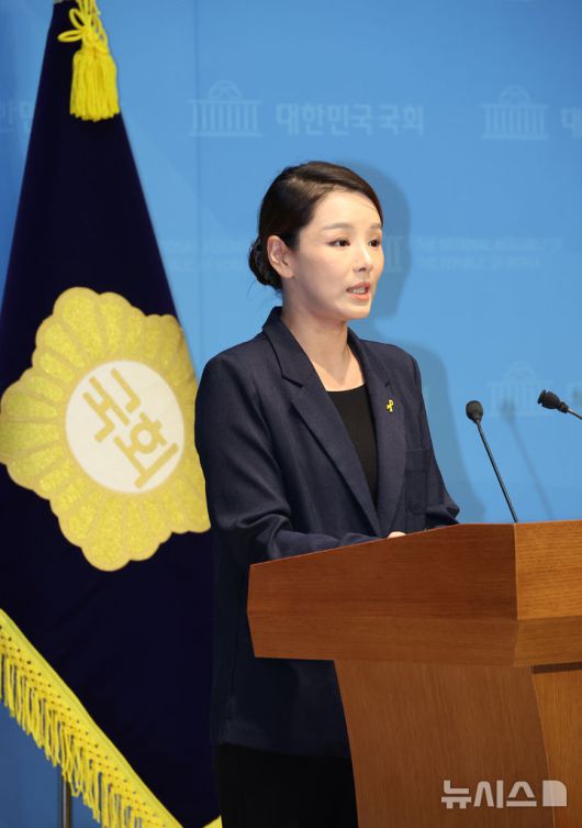[서울=뉴시스] 김금보 기자 = 강미정 조국혁신당 대변인이 4일 서울 여의도 국회 소통관에서 당내 성비위 의혹과 관련한 탈당 기자회견을 하고 있다. 2025.09.04. kgb@newsis.com