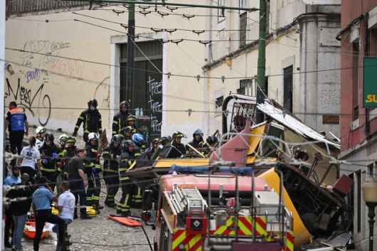 3일 포르투갈 수도 리스본에서 푸니쿨라가 추락해 구조작업이 이뤄지고 있다. 로이터 연합뉴스 |