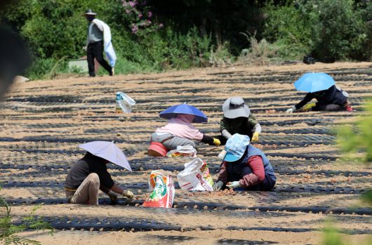 폭염과 극한 가뭄이 이어지고 있는 강원 강릉의 한 농촌 마을에서 지난달 21일 인부들이 뜨거운 햇볕을 피하기 위해 우산 모자를 쓴 채 쪽파를 심고 있다. 연합뉴스 |
