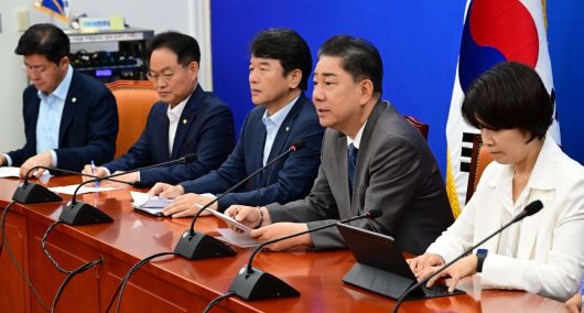 김병기(오른쪽 두번째) 더불어민주당 원내대표가 4일 오전 서울 여의도 국회에서 열린 정책조정회의에 참석해 모두발언하고 있다. 이상섭 기자 |