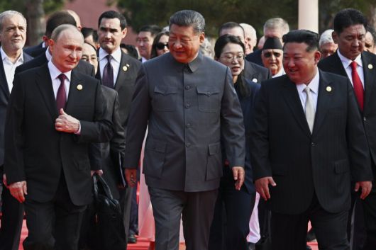 시진핑 중국 국가주석, 블라디미르 푸틴 러시아 대통령, 김정은 북한 국무위원장이 지난 3일(현지 시간) 전승절 80주년 열병식을 앞두고 톈안문 망루에 오르고 있다. AP뉴시스 |