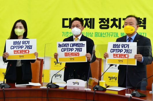 2022년 4월 21일 오전 국회에서 열린 정의당 대표단회의에서 당시 배진교 원내대표 등 참석자들이 환태평양경제동반자협정(CPTPP) 가입 반대 피켓을 들고 구호를 외치고 있다. [헤럴드경제DB] |