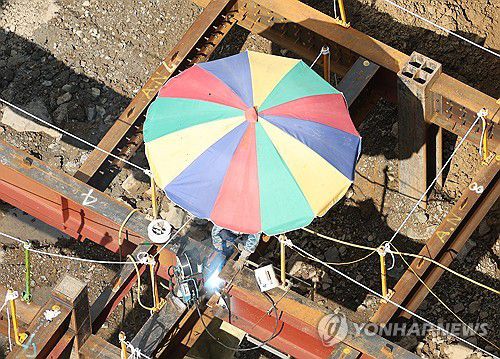 지난 8월 5일 대구 한 건설 현장 근로자가 햇볕을 막아주는 파라솔 아래에서 작업을 하고 있다. [연합뉴스 자료사진] |