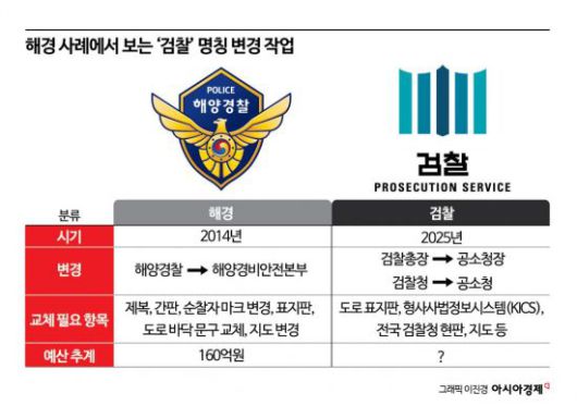 과거 해양경찰청이 국민안전처로 편입되고 이름이 '해양경찰'에서 '해양경비안전본부'로 바뀔 당시 간판·제복·함정 도색 등에 160억원의 예산 추산이 나왔다. 그때도 '소모성 비용'이란 비판이 높았다. 검찰 명칭 변경에도 수백억 원대의 혈세가 쓰일 가능성이 크다. 그러나 관련 비용추계조차 나오지 않고 있다.