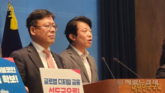 이강일(오른쪽) 더불어민주당 의원이 4일 국회 소통관에서 원화 스테이블코인 도입을 골자로 한 법안을 발의하겠다는 기자회견을 개최했다. 유혜림 기자 |