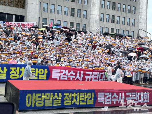 국민의힘은 최고위원회의 직후 국회 본청 앞으로 나가 규탄대회를 열었다. 비가 와 우산 등이 뒤엉키면서 어수선한 분위기였지만 국민의힘 의원들은 "야당 말살 압수수색 중단하라, 야당 탄압 정치보복 중단하라" 등의 구호를 외쳤다.