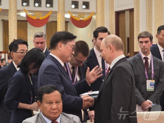우원식 국회의장이 3일 중국 베이징에서 열린 전승절 80주년 기념식 리셉션에서 블라디미르 푸틴 러시아 대통령과 대화하고 있다. (국회의장실 제공) 2025.9.3/뉴스1 ⓒ News1 김일창 기자 |