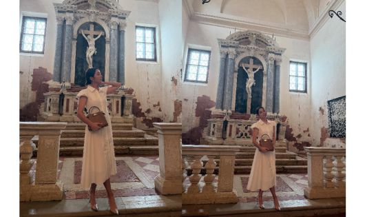사진 속 이민정은 이탈리아의 분위기를 물씬 풍기는 고풍스러운 성당 내부에서 깔끔한 화이트 원피스에 브라운 토트백과 하이힐을 함께 매치해 이민정 특유의 단아하면서도 화려한 분위기를 자랑했다.