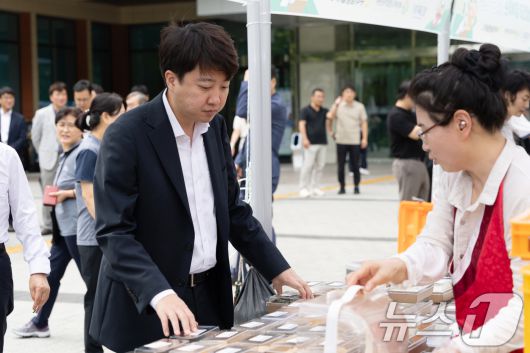 (서울=뉴스1) 이승배 기자 = 이준석 개혁신당 대표가 4일 서울 여의도 국회 소통관 앞에서 열린 화성 로컬푸드 직거래 국회 판매행사장을 찾아 식품들을 둘러보고 있다. 2025.9.4/뉴스1photolee@news1.krCopyright ⓒ 뉴스1. All rights reserved. 무단 전재 및 재배포, AI학습 이용 금지.