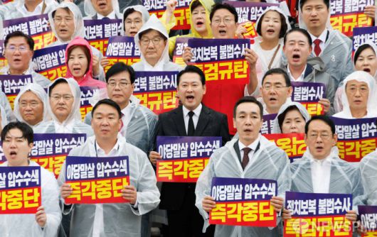 송언석 원내대표도 규탄사에서 "지금 이 시간 특검에서 압수수색 영장을 가지고 국회 본관에 들어왔다고 한다"며 "무도한 집권여당은 특검을 통해서 검찰을 무시했고, 특별재판부를 통해 법원을 완전히 망가뜨리려고 하고 있다"고 성토했다.