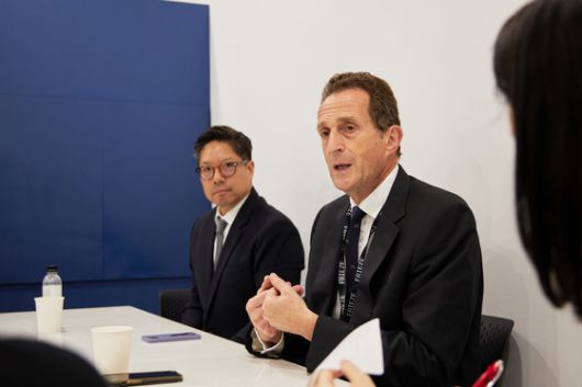 4일 코엑스 C홀 미디어 라운지에서 기자들을 만나고 있는 사이먼 폭스 프리즈 대표(오른쪽). [사진 프리즈] |