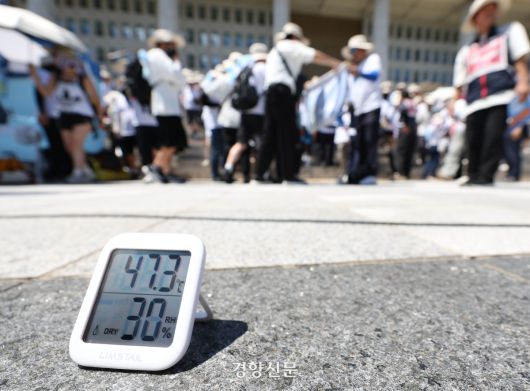 국회 계단에 설치한 온도계에 ‘47.3도’가 떠있다. 한수빈 기자 |